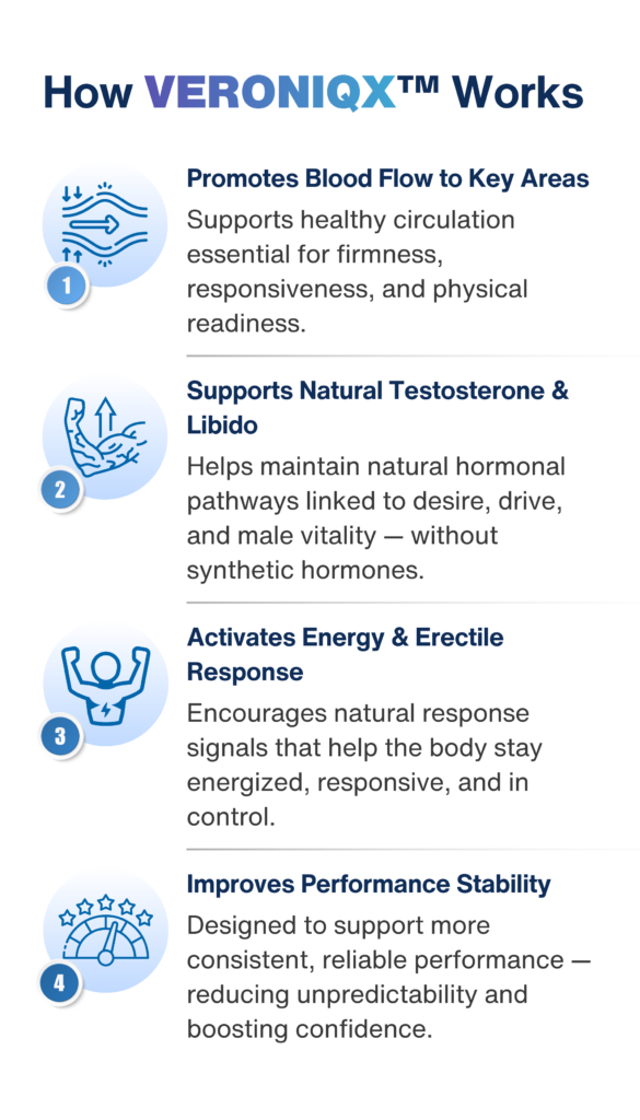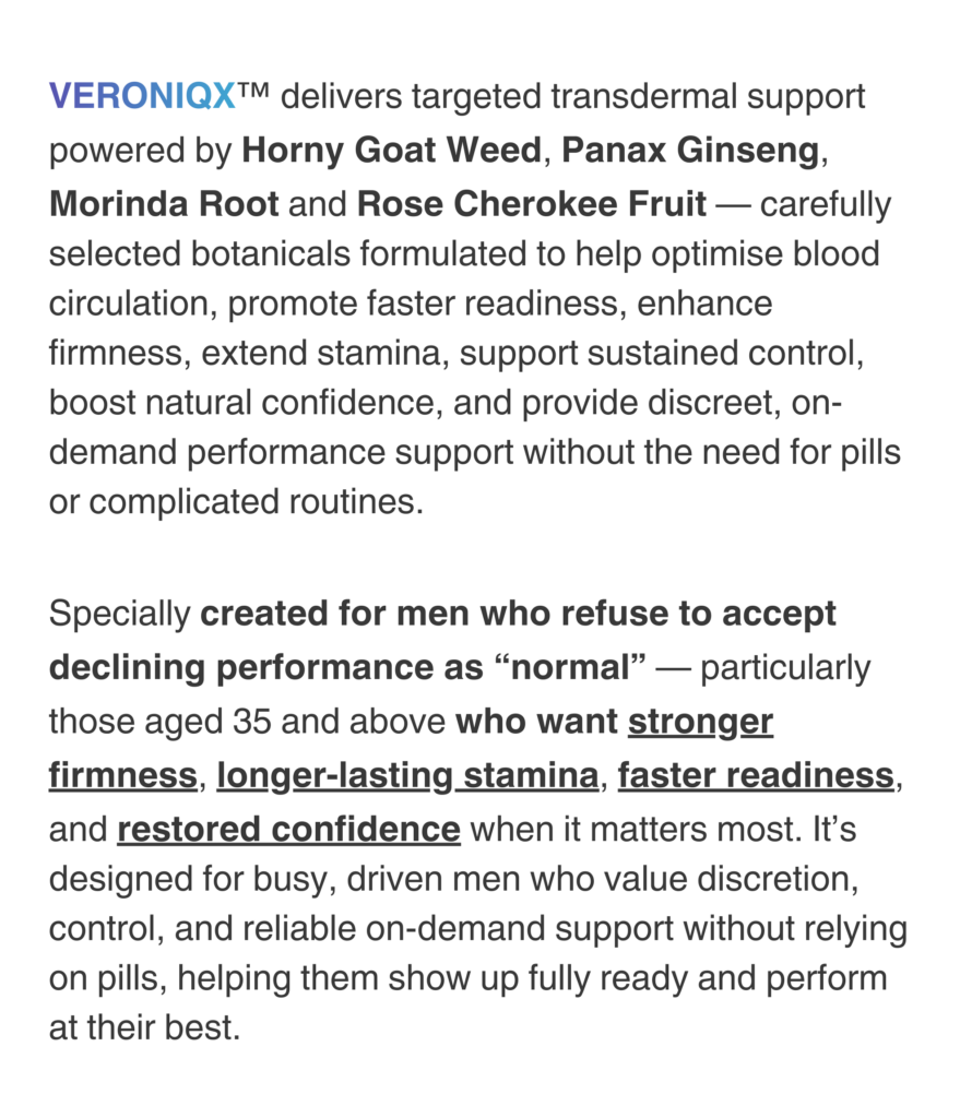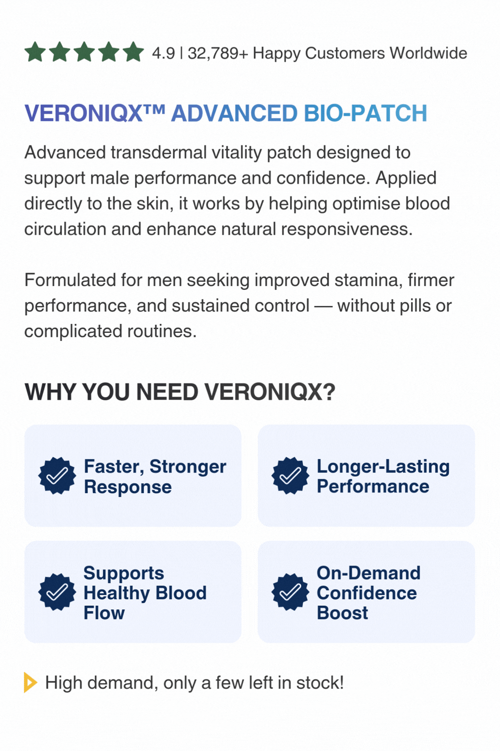 VERONIQX™ is formulated with carefully selected performance-support ingredients designed to help optimise blood circulation, enhance responsiveness, and support sustained stamina. Each patch is developed to deliver targeted support through transdermal absorption — helping men achieve firmer, longer-lasting performance without oral supplements.